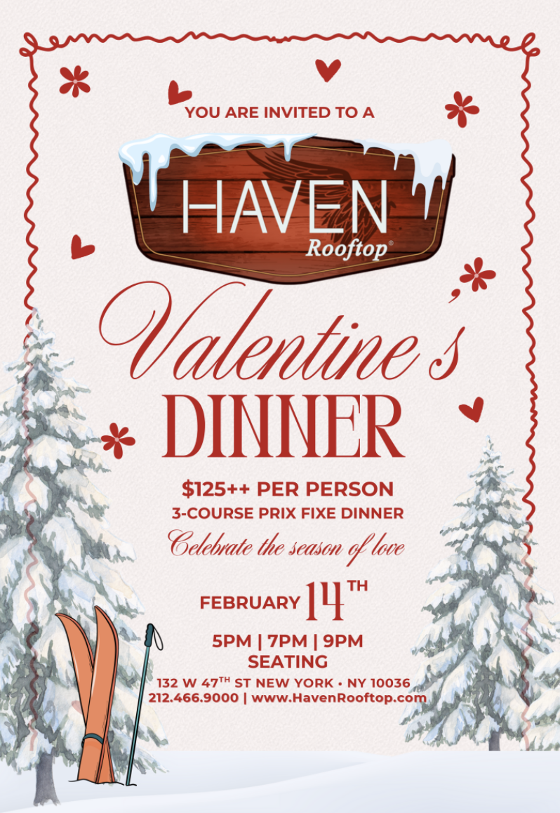 This Valentine’s Day, Haven Rooftop (132 W. 47th Street) above the Sanctuary Hotel invites couples to escape Midtown and dine sky-high with city views, crave-worthy plates, and craft cocktails that set the mood. Seatings are at 5 PM, 7 PM, and 9 PM for a $125 three-course prix fixe dinner. Guests can start with a choice of kale salad, lobster corn soup, tuna & avocado, or crab cake; enjoy an entrée of petite filet mignon with mashed potatoes, sesame-crusted tuna with seaweed and Japanese aioli, fresh truffle spaghetti, or roasted chicken with fries, mixed salad, and lemon truffle sauce; and finish with chocolate-covered strawberries, crème brûlée, or tiramisu. Known for crowd-pleasing favorites like sliders, a tower of tuna tartare, Buffalo wings, branzino, ‘Havenly’ chicken, and steak au poivre with peppercorn sauce, Haven pairs elevated comfort fare with signature cocktails like the Cloudtini and Solstice for a celebration that’s both romantic and effortlessly fun. Make your reservations on OpenTable here: https://www.opentable.com/booking/restref/availability?lang=en-US&correlationId=e725030c-01a9-431a-a568-63ea44cd9b81&restRef=90400&otSource=Restaurant%20website