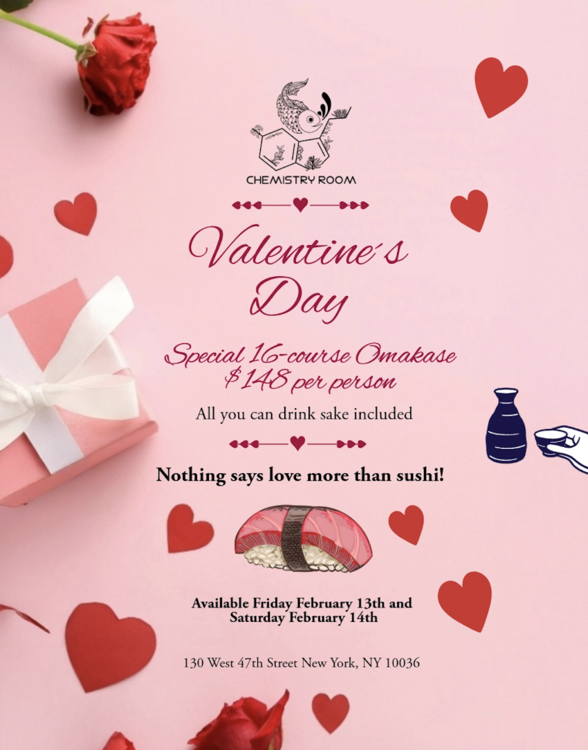 For a more intimate and indulgent Valentine’s celebration, The Chemistry Room at Sushi Lab (132 W. 47th Street) offers a 16-course omakase dinner with all-you-can-drink sake for $148 per person, set within the luxury Sanctuary Hotel in the heart of Times Square with seatings at 4:30 PM, 6:30 PM, and 8:30 PM on both Friday, February 13th and Saturday, February 14th. Designed for sushi lovers in pursuit of pure umami, the experience showcases meticulously sourced seasonal ingredients and innovative technique, delivering a multi-course journey that’s refined, immersive, and perfect for couples looking to trade roses for raw fish and a very generous sake pour. Make your reservations on Resy here: https://resy.com/cities/new-york-ny/venues/the-chemistry-room-by-sushi-lab/events/valentines-day-in-the-chemistry-room-2026-02-13\