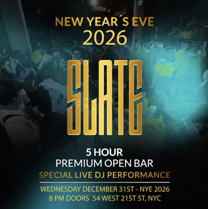 Slate (54 W 21st St) is taking over New Year’s Eve with an all-night celebration in the heart of Chelsea. From 8 PM to 4 AM, guests can toast to 2026 with a 5-hour open bar, complimentary appetizers, and a live DJ spinning the best beats across the venue’s sleek, multilevel space. As midnight approaches, enjoy a champagne toast and watch the Times Square Ball Drop on Slate’s massive in-house screens while the DJ leads a high-energy countdown to the new year. For those looking to go all out, VIP upgrades offer exclusive table and bottle service with reserved nightclub seating. Whether you’re dancing into dawn or raising a glass with friends, Slate has everything you need for an unforgettable start to 2026. Tickets available here.