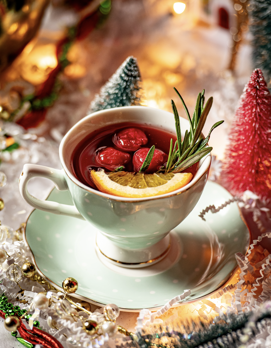 A cranberry lemon drop–style martini made with house cranberry jam, garnished with a rosemary “Christmas tree” and skewered cranberries. Festive, tart, and playful.
