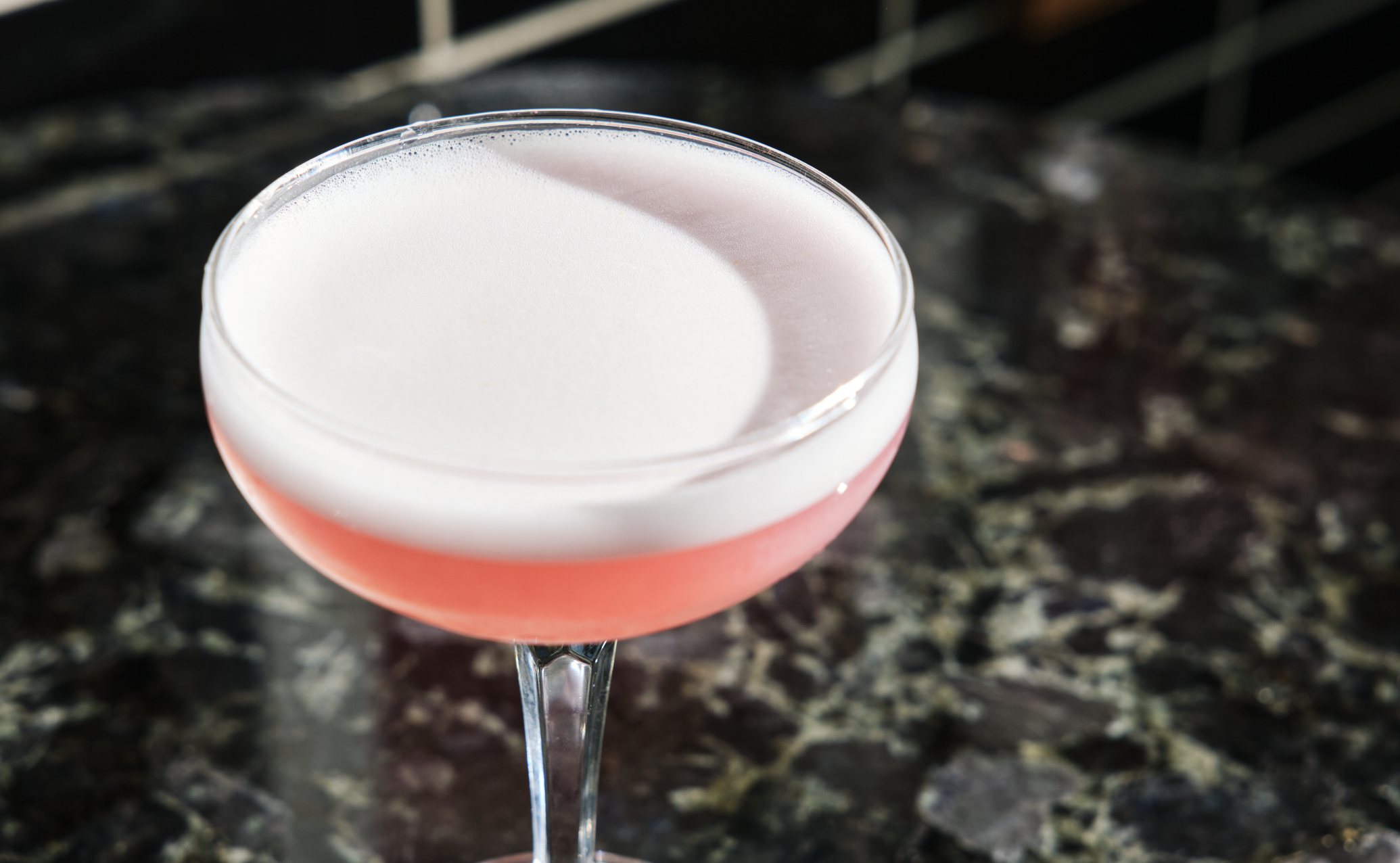 A festive vodka cranberry with ginger, a hint of miso for depth, and a light foam finish—served with skyline views.